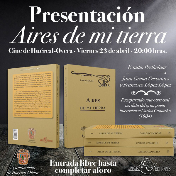 El Cine municipal de Huércal-Overa acoge mañana viernes 23 de abril la presentación del libro Aires de mi Tierra de Carlos Camacho, un evento organizado por el Ayuntamiento y Arráez Editores con motivo del Día del Libro.